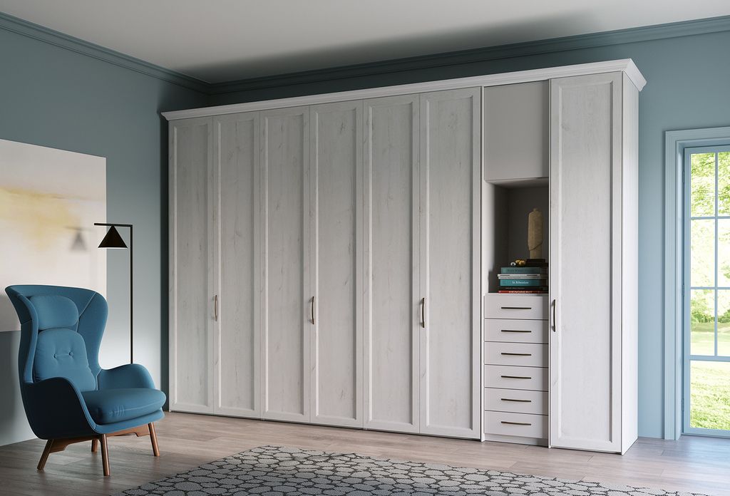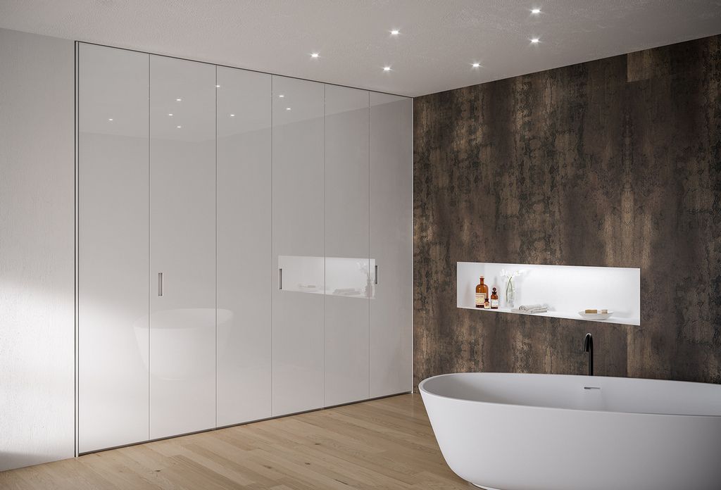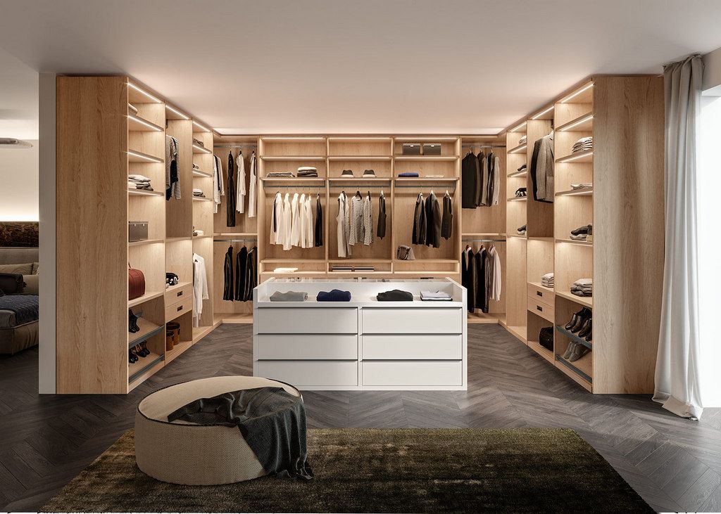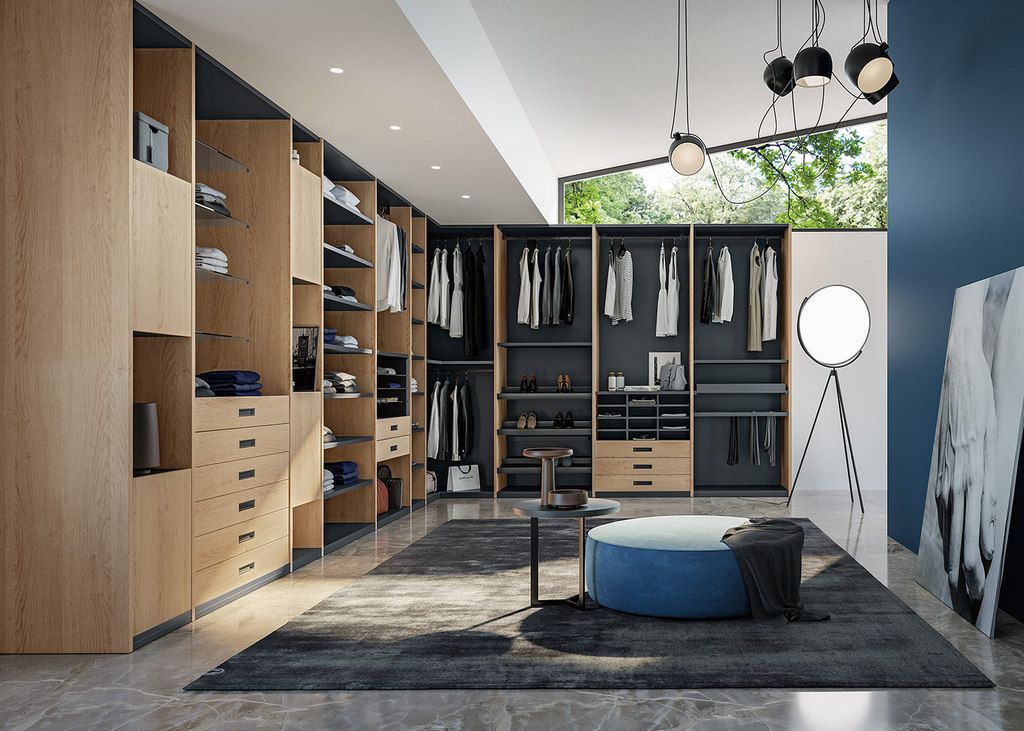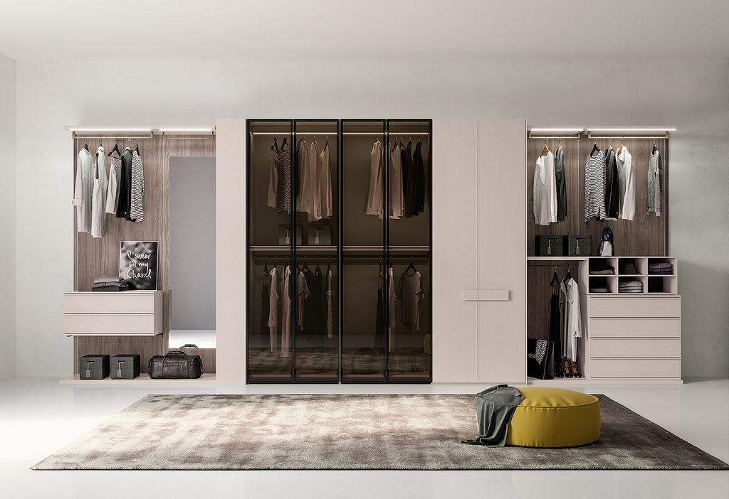 Per un design coordinato, le cabine armadio vengono realizzate con gli stessi materiali dei mobili, quali legno, laminato, vetro o eco-materiali e finiture come laccato, nobilitato o laccato soft touch.